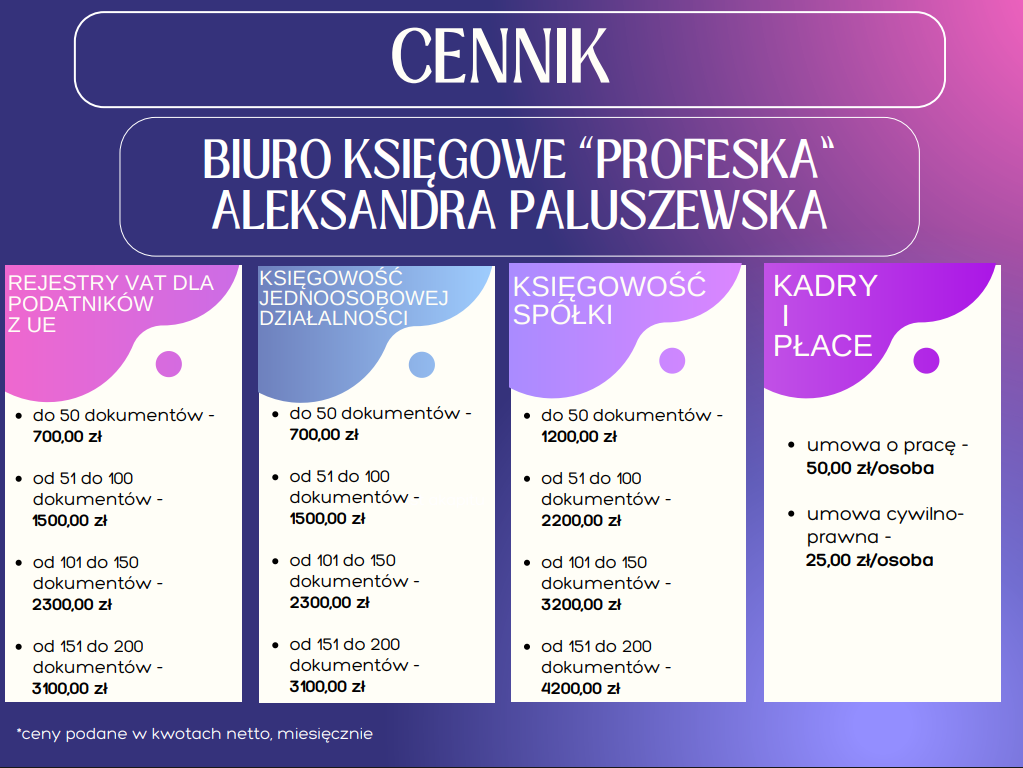 Nie wierzymy w uniwersalne rozwiązania, bo każdy biznes jest inny. Dlatego ceny naszych usług ustalamy indywidualnie, w oparciu o rzeczywiste potrzeby i zakres obsługi księgowej. Zamieszczony cennik ma charakter poglądowy, a ostateczne warunki cenowe ustalane są podczas rozmowy z klientem.